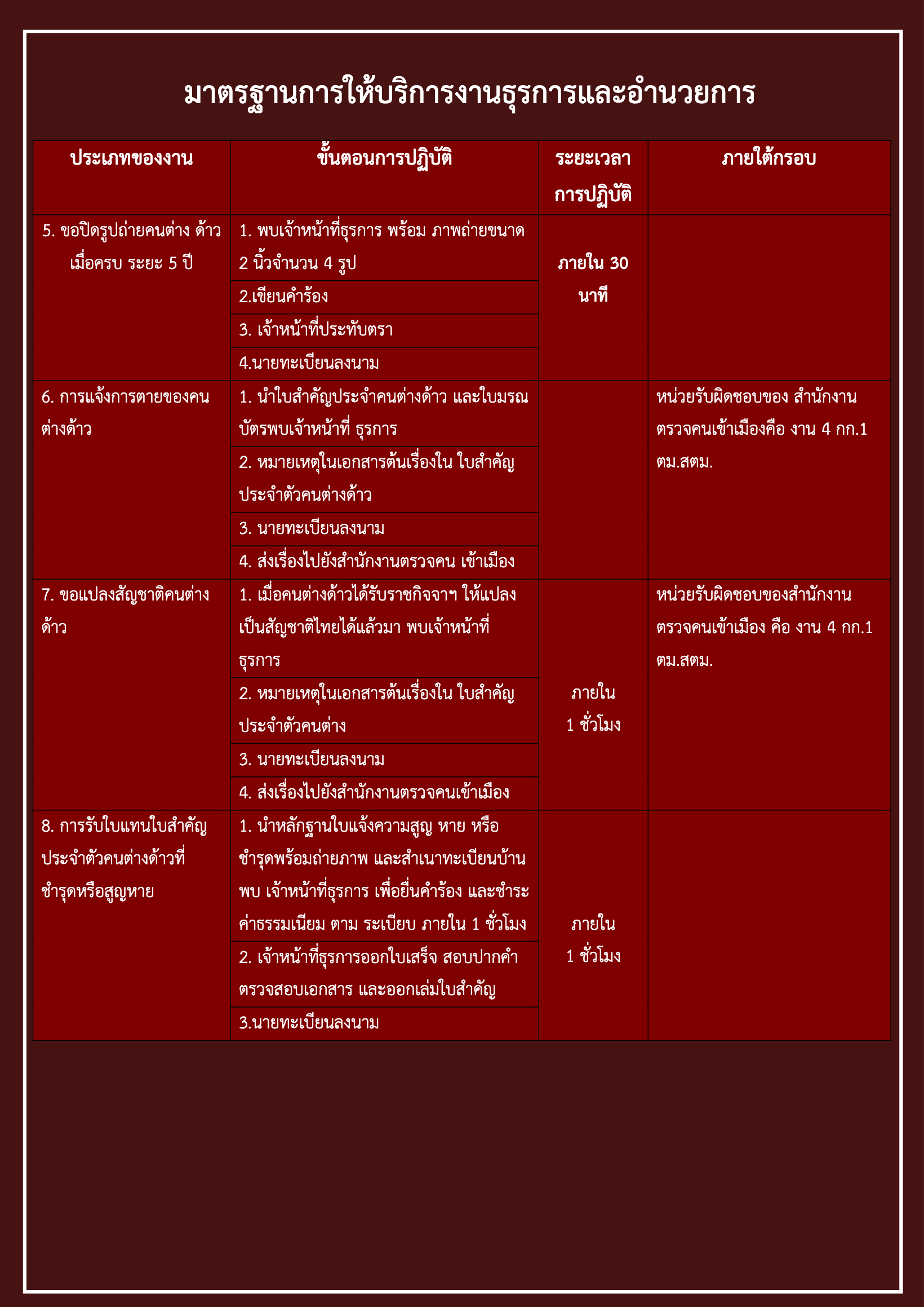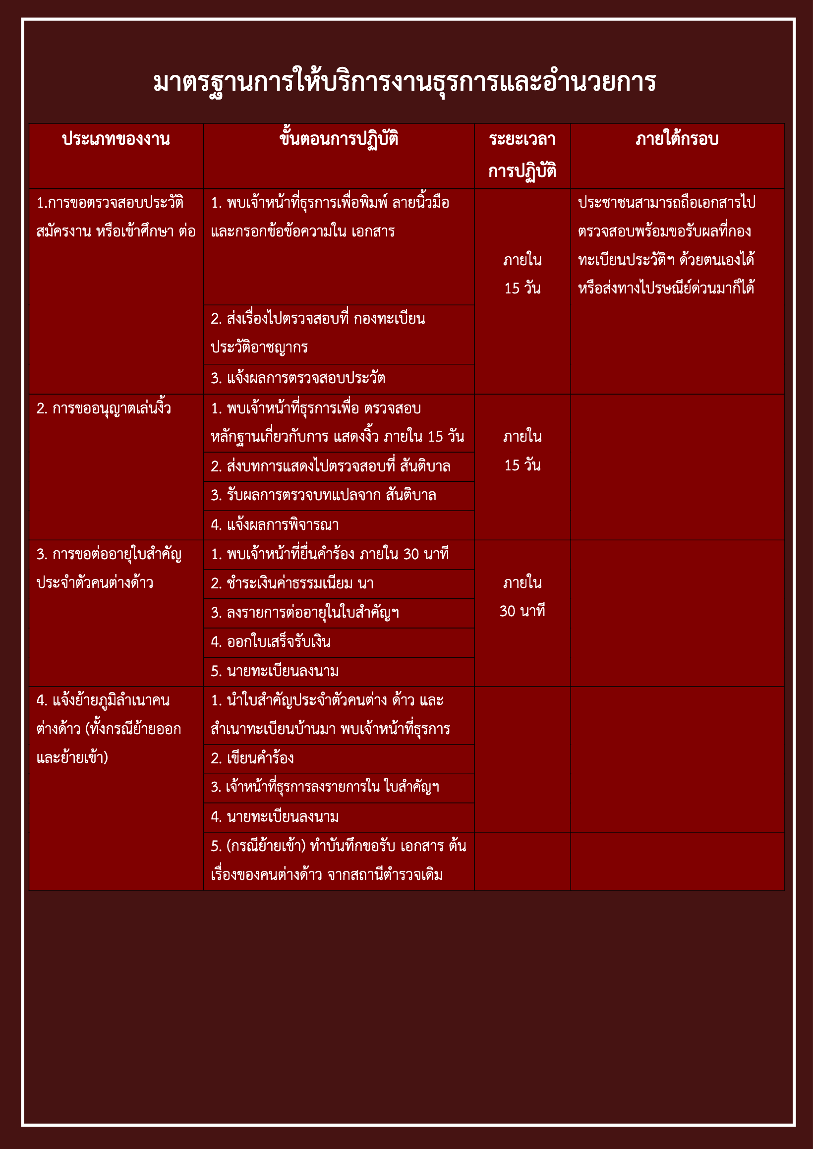 คู่มือการให้บริการประชาชน ประเภทงานให้บริการ / ขั้นตอนและมาตรฐานการให้บริการ ตามสายงานต่าง ๆ