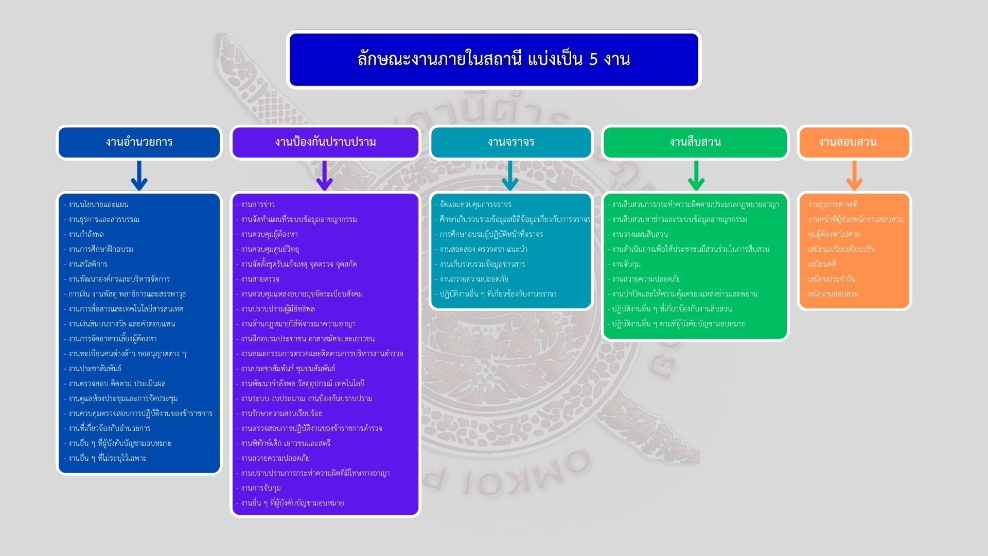 งานอื่น ๆ ที่เกี่ยวข้องกับสถานีตํารวจ ซึ่งงานในสถานีตํารวจ แบ่งออกเป็น 5 สายงาน ดังนี้